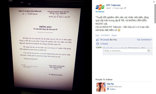 Tết đã sắp đến, FPT Telecom ra hẳn thông báo số 13-2013/FPT-TEL/TB cấm nhân viên biếu tặng quà cấp trên trong dịp lễ Tết này, và còn thêm câu “không cấm điều ngược lại”. Đúng là văn hóa FPT luôn là đặc sắc, “1-0-2”.