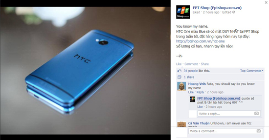 FPT Shop sẽ có một mặt hàng độc quyền được nhập về trong tuần tới và đã bắt đầu nhận đặt hàng, đó là chiếc smartphone HTC One màu xanh lam (blue). Ngoài ra, HTC One, cỗ máy được gia công tỉ mỉ bằng nhôm nguyên khối, còn có các màu đen, bạc, vàng và đỏ.