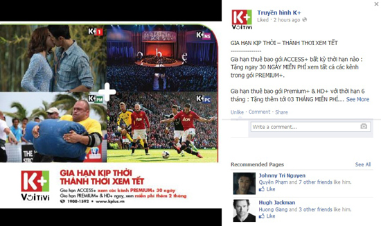 Trong hàng loạt chương trình khuyến mãi của K+ trong vòng hơn chục ngày từ nay cho đến hết tháng 1 có ưu đãi dành cho tất cả các thuê bao gói bất kỳ gia hạn hợp đồng. Thuê bao gói Access+ sẽ được xem miễn phí gói Premium+ 30 ngày, còn thuê bao gói Premium+ và HD+ khi gia hạn 6 tháng sẽ được tặng thêm 2 tháng miễn phí.