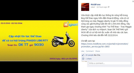 MobiFone giới thiệu dịch vụ mSport đến với khách hàng, với lợi ích là không chỉ được cập nhật liên tục thông tin thể thao nóng hổi ngay trên điện thoại di động mà còn là cơ hội trúng xe máy Piaggio Liberty trị giá 70 triệu đồng trong chương trình “Vui Thể thao - Trao Piaggio Liberty”. Chương trình này còn kéo dài đến hết ngày 22/2, giải thưởng mỗi tuần trị giá cũng lên đến 1 triệu đồng.