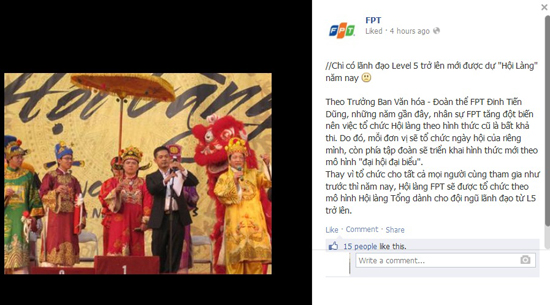 Tết sắp đến và FPT cũng đang rục rịch chuẩn bị tổ chức “Hội làng”, một hoạt động văn hóa mang nét truyền thống. Theo Trưởng Ban Văn hóa - Đoàn thể FPT Đinh Tiến Dũng, do những năm gần đây nhân sự FPT tăng đột biến nên việc tổ chức “Hội làng” theo hình thức cũ là bất khả thi, mà phải tổ chức theo mô hình “đại hội đại biểu” từ các đơn vị thành viên.