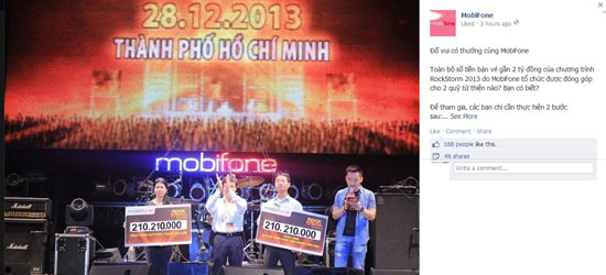 MobiFone đang tổ chức đố vui có thưởng với câu hỏi là nơi được MobiFone đóng góp quỹ từ thiện số tiền bán vé chương trình RockStorm 2013 gần 2 tỷ đồng. Cuộc chơi này sẽ kết thúc vào 12 giờ ngày 2/3 và 3 người trả lời đúng cũng như may mắn nhất sẽ nhận được thẻ nạp trị giá 50.000 đồng.