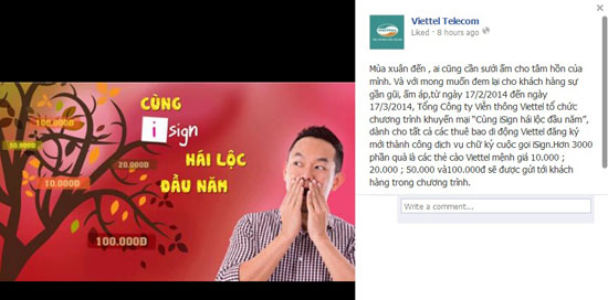 Hiện nay, Viettel đang tổ chức chương trình khuyến mãi “Cùng iSign hái lộc đầu năm”. Cụ thể hơn là cho đến 17/3, tất cả các thuê bao di động Viettel khi đăng ký mới thành công dịch vụ chữ ký cuộc gọi iSign sẽ nhận được các phần quà là thẻ cào mệnh giá dao động từ 10.000 đến 100.000 đồng.