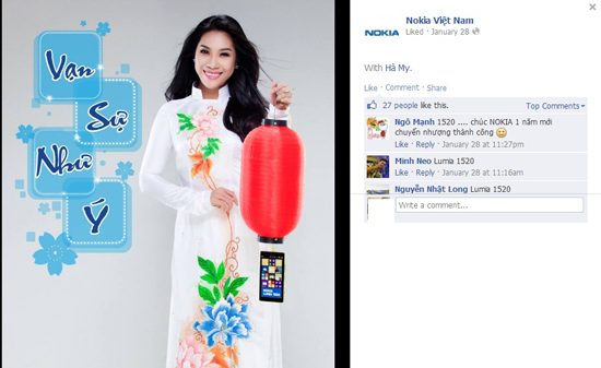 Trên Facebook của Nokia, 8 thí sinh lọt vào chung kết chương trình Giọng hát Việt 2013 đã thay mặt gửi đến tất cả mọi người những lời chúc Tết tốt đẹp nhất. Trong ảnh là thí sinh Hà My với lời chúc “Vạn Sự Như Ý”.