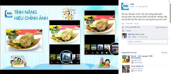 Zalo giới thiệu cho người sử dụng tính năng hiệu chỉnh ảnh trước khi chia sẻ với bạn bè. Với những hiệu ứng tùy chọn như “đông sáng” hay “kỷ niệm”, những bức ảnh chụp “thịt mỡ dưa hành câu đối đỏ, cây nêu tràng pháo bánh chưng xanh” sẽ trở nên đậm sắc thái hơn.