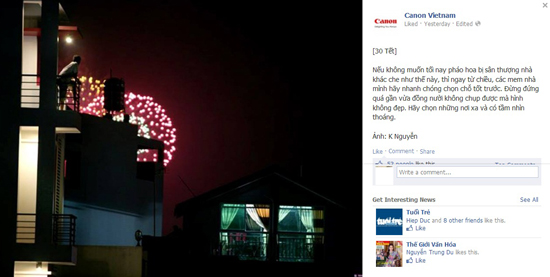 Sắp đến giao thừa, Canon chia sẻ với các fan những khó khăn rất thực tế khi muốn khi lại cảnh bắn pháo hoa. Lời khuyên là hãy chọn chỗ tốt, có tầm nhìn thoáng để không bị sân thượng nhà khác che khuất như trong ảnh những chỗ đó cũng không nên quá đông.
