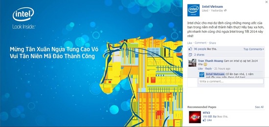 Trong không khí mùa xuân mới ngập tràn, Intel viết đôi câu đối ý nghĩa tặng tất cả mọi người: “Mừng tân xuân ngựa tung cao vó, vui tân niên mã đáo thành công”.