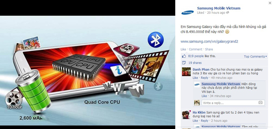 Smartphone Galaxy Grand 2 tiếp tục được coi là sản phẩm mũi nhọn của Samsung trong khúc thị trường tầm trung, với giá chỉ 8.490.000 đồng. Về thông số cấu hình, Galaxy Grand 2 cũng khá mạnh với bộ xử lý lõi tứ hay pin 2.600 mAh (chạy liên tục 10 tiếng).
