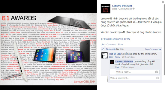 Lenovo vừa khoe chiến tích nhận được tổng cộng 61 giải thưởng tại Triển lãm CES 2014 vừa qua, tính trong tất cả các hạng mục về sản phẩm, thiết kế.