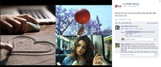 LG có dịp chơi “đuổi hình bắt chữ” với các fan về G2, với đáp án là Rear Key, một đặc điểm khác biệt của chiếc smartphone này. 4 bức ảnh trong hình có đặc điểm chung là dùng ngón tay trỏ để bấm chuột, quay bóng, vẽ trên cát hoặc vê tóc. Và ngón tay trỏ cũng là ngón người sử dụng cần dùng nhiều nhất với cụm phím sau Rear Key để tắt mở, chỉnh âm lượng.