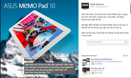 ASUS thông báo máy tính bảng MeMO Pad 10 đã có mặt trên thị trường Việt Nam và hiện có giá 4.590.000 đồng. MeMO Pad 10 có thế mạnh là màn hình 10 inch IPS HD nên việc đọc sách báo, duyệt web và xem phim thú vị hơn. Ngoài ra, MeMO Pad 10 cũng có thể kết nối 3G thông qua cáp lưu động OTG.