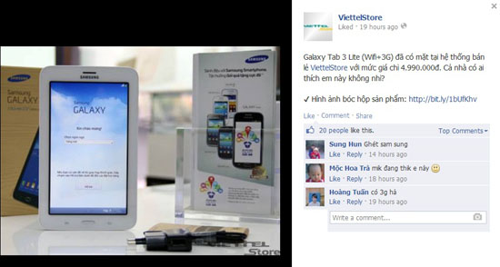 Như vậy mẫu máy tính bảng Samsung Galaxy Tab 3 Lite (Wifi + 3G) đã có mặt tại hệ thống bán lẻ ViettelStore, vài tuần sau khi được Samsung cho ra mắt trên toàn thế giới. Mức giá của mẫu máy tính bảng hạng nhẹ này là 4.990.000 đồng.