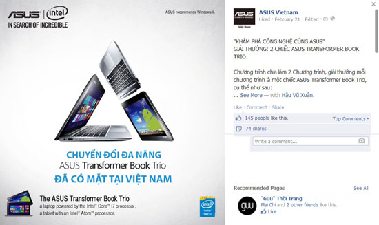 ASUS đang tổ chức một lúc 2 chương trình vui chơi có thưởng với phần quà là chiểc Transformer Book Trio. Trong chương trình online, các fan sẽ phải trả lời câu hỏi, còn trong chương trình 2, những thành viên hoạt động tích cực trên fanpage sẽ được thi viết cảm nhận về sản phẩm sau buổi offline giới thiệu các công nghệ mới của ASUS vào ngày 2/3.