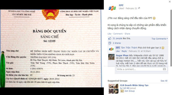 Trên Facebook, FPT khoe tấm bằng sáng chế đầu tiên, được Cục Sở hữu Trí tuệ (thuộc Bộ Khoa học và Công nghệ) cấp để bảo hộ cho “Hệ thống nhận biết trạng thái các ngón tay di chuyển và nhấn trên vùng không gian ảo giới hạn”. Nghe qua thì hệ thống của FPT đi theo xu hướng của Leap Motion hay Kinect.