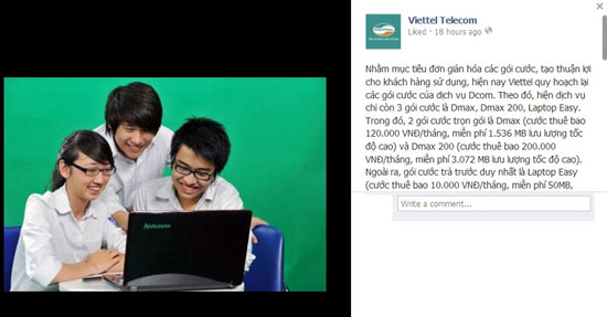 Viettel vừa thông báo việc quy hoạch lại các gói cước của dịch vụ Dcom nhằm mục tiêu đơn giản hóa cho người sử dụng. Theo đó, hiện dịch vụ chỉ còn 3 gói cước là Dmax, Dmax 200 và Laptop Easy. 2 gói cước trọn gói là Dmax (cước thuê bao 120.000 đồng/tháng, miễn phí 1.536 MB lưu lượng tốc độ cao) và Dmax 200 (cước thuê bao 200.000 đồng/tháng, miễn phí 3.072 MB lưu lượng tốc độ cao). Laptop Easy là gói trả trước duy nhất.