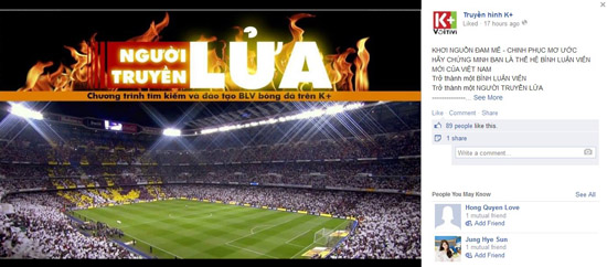 Hoạt động của K+ đang rất sôi nổi với việc khởi động chương trình tìm kiếm và đào tạo bình luận viên bóng đá mang tên “Người Truyền Lửa” mùa 2. Người tham dự có thời hạn để gửi hồ sơ đăng ký thi vòng sơ loại đến ngày 10/4, và trong hồ sơ đã bao gồm một file audio hoặc video thu giọng bình luận thử trong 5 phút.
