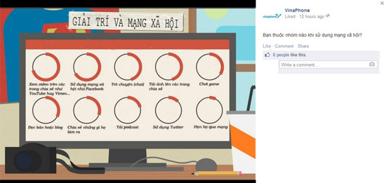“Bạn thuộc nhóm nào khi sử dụng mạng xã hội?” VinaPhone vừa chia sẻ những hình minh họa sinh động kết quả khảo sát thói quen sử dụng mạng xã hội của mọi người. Có vẻ như phần nhiều người vẫn thường xuyên xem các video trên các trang chia sẻ như YouTube hay Vimeo nhất, tiếp đó là sử dụng Facebook.