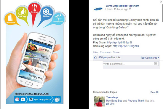Samsung đang khuyến khích người sử dụng tải ứng dụng Quà tặng Galaxy để luôn cập nhật những tin tức khuyến mại trong nhiều lĩnh vực như ẩm thực, vui chơi, giải trí, mua sắm, làm đẹp hay công nghệ. Ứng dụng này mới được nâng cấp lên phiên bản 1.5 vào ngày 14/3 vừa qua và được chấm điểm 4,7/5 sao trên kho Google Play.