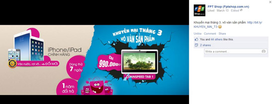 Trong vô vàn các chương trình ưu đãi tháng 3, ngoài việc khách mua hàng được dùng thử iPhone và iPad 7 ngày, FPT còn cho biết có mẫu máy tính bảng giá chỉ 990.000 đồng. Đó là chiếc Connspeed Tab 1, với giá cũ là 1.290.000 đồng.