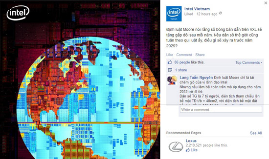 Ngày cuối tuần, Intel dành thời gian cho các fan tán chuyện về Định luật Moore, định luật được người đồng sáng lập ra Intel Gordon Earle Moore phát biểu từ năm 1965 mà đến giờ vẫn đúng, rằng mật độ bóng bán dẫn trên vi xử lý cứ sau 2 năm sẽ tăng gấp đôi. Nếu giả thiết tốc độ tăng trưởng ấy đúng cả với tốc độ tăng dân số thế giới thì đúng là có nhiều chuyện để tán.