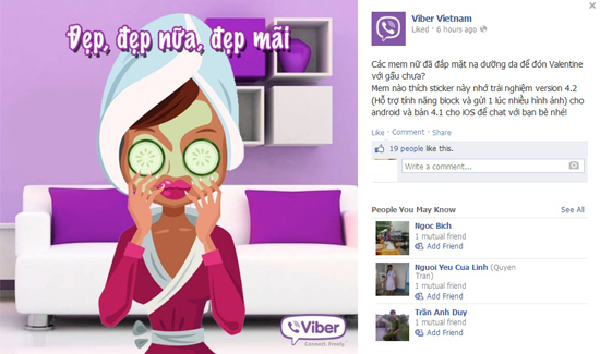 Hôm nay Viber tiếp tục khuyến khích người sử dụng nâng cấp ứng dụng lên phiên bản 4.2 cho Android và 4.1 cho iOS. Những phiên bản cập nhật này sẽ hỗ trợ thêm tính năng block và gửi một lúc nhiều hình ảnh. Ngoài ra Viber còn tặng những sticker Valentine đáng yêu như trên hình.