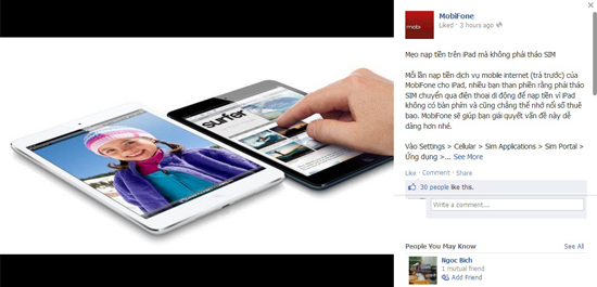 MobiFone chỉ ra một thực tế là mỗi lần nạp tiền dịch vụ mobile internet của MobiFone cho iPad, nhiều khách hàng phải tháo SIM chuyển qua điện thoại di động để nạp tiền vì iPad không có bàn phím và cũng chẳng thể nhớ nổi số thuê bao. Tuy nhiên có một cách tiện ích hơn, đó là vào Settings > Cellular > SIM Applications > SIM Portal > Ứng dụng > Tiện ích > Tra cước để nạp tiền.