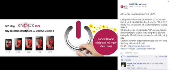 LG tuyên bố cập nhật tính năng Knock On, gõ 2 lần liên tiếp để mở hoặc tắt, cho tất cả các smartphone thuộc dòng L II ra mắt năm 2013 như L1 II, L3 II, L4 II, L5 II hay L7 II. Tính năng Knock On xuất hiện lần đầu tiên trên chiếc G2 của LG.