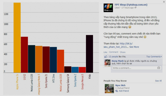 Theo bảng xếp hạng smartphone trong năm 2013 được FPT Shop chia sẻ, iPhone 5S đã chứng minh được đẳng cấp “Quả táo” khi dẫn đầu tuyệt đối. Điều bất ngờ là LG G2 chiếm vị trí số 2, vị trí số 3 thuộc về Nokia Lumia 1520, rồi sau đó mới đến Samsung Galaxy Note 3 và Sony Xperia Z1.