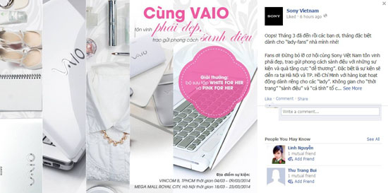 Tháng 3 này, Sony dự kiến sẽ tổ chức chuỗi sự kiện dành riêng cho các fan nữ với những hoạt động và quà tặng dễ thương. Tại TP.HCM, chuỗi sự kiện sẽ diễn ra ở Vincom B trong khoảng thời gian từ 10 đến 22 giờ hàng ngày từ 4/3 đến 9/3. Tại Hà Nội, sự kiện sẽ diễn ra ở Royal City trong khoảng từ 10 đến 22 giờ từ 18/3 đến 23/3.
