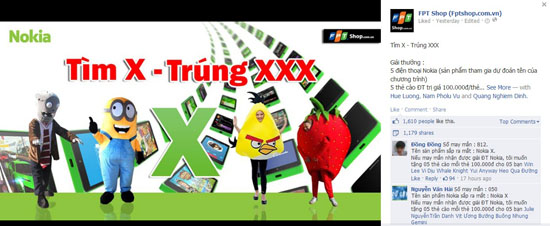 FPT Shop đang tổ chức một trò chơi may mắn nhỏ trên fanpage mang tên “Tìm X - Trúng XXX”, với giải thưởng là 5 chiếc điện thoại Nokia X và 25 thẻ cào trị giá 100.000 đồng. Thời hạn trò chơi được tính đến 11 giờ sáng ngày 9/3.
