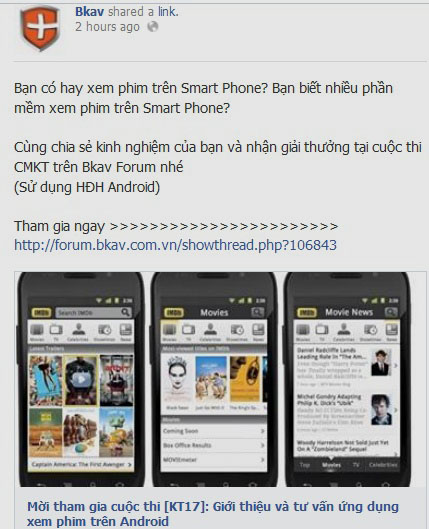 Bkav vừa đăng thể lệ cuộc thi viết bài tư vấn ứng dụng xem phim trên hệ điều hành Android để tạo sân chơi cho các thành viên trên diễn đàn, thời gian từ nay đến 12 giờ ngày 14/3. Giải cao nhất của cuộc thi là 1 triệu đồng tiền mặt, 2 thẻ Bkav Pro và 500 thẻ REP point (điểm diễn đàn Bkav).