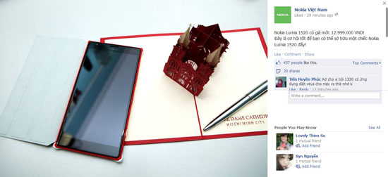 Nokia vừa thông báo giá mới của mẫu điện thoại Lumia 1520, cụ thể là 12.999.000 đồng. Đây được khẳng định là cơ hội tốt chưa từng có để sở hữu một chiếc Lumia 1520. Nick Ngô Chí Tường kết luận: “Rẻ hơn Xperia Z Ultra, Note 3 với One Max rồi”.
