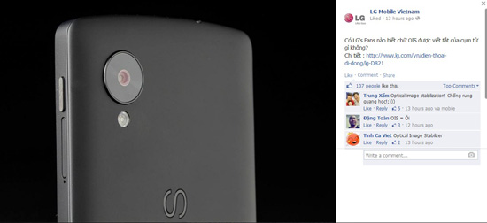 LG mở đầu cuộc tranh luận về camera của các dòng máy của mình khi thử kiến thức các fan với câu hỏi “OIS là gì?” Rất nhiều người biết OIS là viết tắt của Optical Image Stabilizer, nghĩa là Kỹ thuật ổn định ảnh quang học, hay đơn giản là chống rung quang học. Nhưng đáng chú ý nhất vẫn là cuộc tranh luận về camera của máy LG. Mặc dù không ít người chê camera LG “xấu”, nhưng bạn Rocky Chan thì nói: “Riêng mình thấy nó lạ và độc đấy. LG thiếu gì kiểu camera vuông vắn mạnh mẽ, lâu lâu đổi kiểu cho lạ cũng ok mà”.