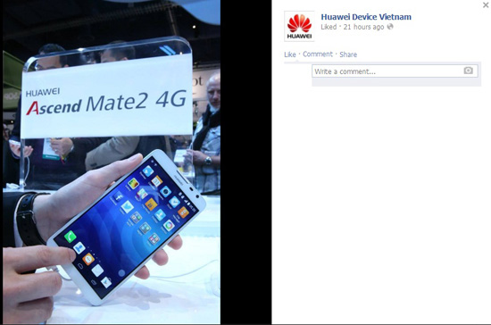 Hãy cùng lên Facebook của Huawei để chiêm ngưỡng chiếc phablet tuyệt đỉnh mang tên Ascend Mate 2, sản phẩm vừa được cho ra mắt tại CES 2014. Ascend Mate 2 có kích thước màn hình 6,1 inch, trang bị chip lõi tứ Kirin 910, camera chính 13 MP, camera phụ 5 MP và hỗ trợ 4G đúng như chiến lược đi tiên phong của Huawei.