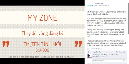 VinaPhone cho biết họ có gói cước My Zone dành cho những thuê bao trả trước thường xuyên thực hiện các cuộc gọi trong nước từ một vùng nhất định. Cước gọi trong vùng đến các số nội mạng chỉ là 880 đồng/phút, trong khi cước gọi ngoại vùng là 1.880 đồng/phút. Gói cước này có thời hạn sử dụng như thuê bao VinaCard.