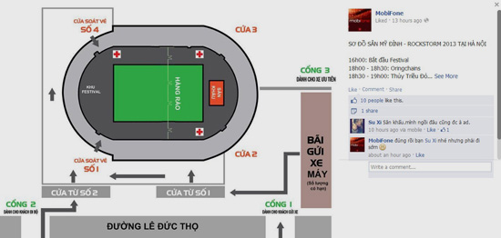 MobiFone vẽ sơ đồ sân Mỹ Đình như một kế hoạch tác chiến để sẵn sàng đón “cơn bão” RockStorm tối nay. Khung giờ cho từng nhóm nhạc cũng đã được ấn định. Với các fan, Ban tổ chức khuyến cáo nên đến sớm, gửi xe trong bãi và không mang theo đồ ăn.