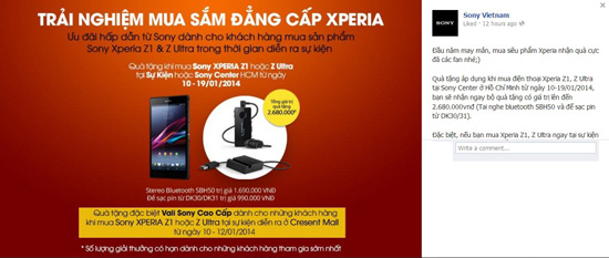Sony vừa công bố một chương trình ưu đãi nữa dành cho khách hàng mua điện thoại Xperia Z1 và Xperia Z Ultra ở TP. Hồ Chí Minh. Đó là từ ngày 10/1 đến 19/1, khách hàng sẽ nhận được bộ quà tặng kèm trị giá 2.680.000 đồng bao gồm tai nghe bluetoot SBH50 và đế sạc pin từ DK30/DK31. Chương trình ưu đãi trước đó là khi mua Z1 hoặc Z Ultra tại sự kiện diễn ra ở Crescent Mall từ ngày 10-12/1, khách hàng sẽ được tặng 1 vali Sony.
