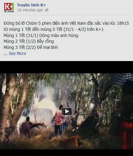 Tết này, K+ sẽ phát liền chùm 5 phim điện ảnh Việt Nam gây được tiếng vang, đều đặn vào lúc 18 giờ 15 từ mùng 1 Tết đến mùng 5 Tết (31/1 - 4/2). 5 bộ phim điện ảnh này gồm có Dòng máu anh hùng, Bẫy rồng, Để mai tính, Sài Gòn Yo, Cưới ngay kẻo lỡ.