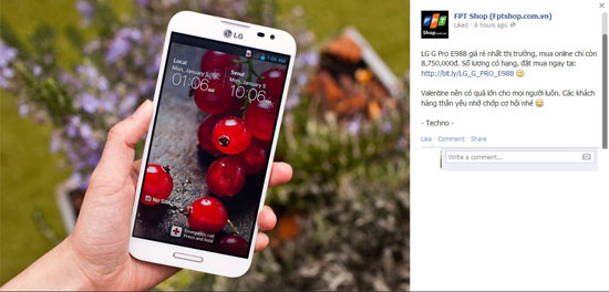 FPT Shop tuyên bố bán chiếc điện thoại LG Optimus G Pro với giá rẻ nhất thị trường, chỉ 8.750.000 đồng so với giá gốc là 10.999.000 đồng. FPT Shop cũng khẳng định nhờ Valentine mà mới có giá rẻ như vậy.