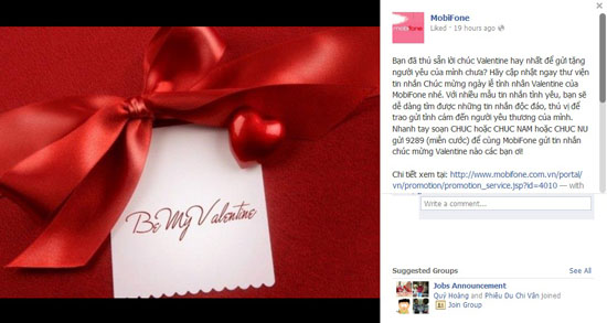 Ngày Valentine, MobiFone cung cấp cho khách hàng một thư viện tin nhắn lời chúc mừng, với cước gửi tin nhắn được áp dụng theo giá cước hiện hành. Để thực hiện, khách hàng chỉ cần soạn tin CHUC hoặc CHUC NAM hoặc CHUC NU gửi 9289 (miễn cước).