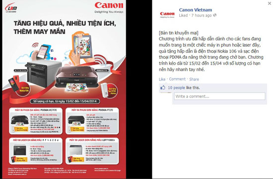 Trong chuyên mục bản tin khuyến mãi, Canon thông báo chương trình ưu đãi dành cho khách hàng mua máy in phun hoặc laser, với quà tặng là điện thoại Nokia 106 và sạc điện thoại PIXMA đa năng. Chương trình này kéo dài từ 15/2 đến 15/4.