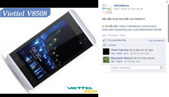 Trên Facebook, ViettelStore dành đất để trưng bày mẫu điện thoại mới nhất của mình là V8508. V8508 là mẫu điện thoại màn hình 4 inch (480x800 pixel), hỗ trợ đa SIM, có máy ảnh 5 Mpx và chạy hệ điều hành Android 4.2.2, nhưng có giá chỉ 1.750.000 đồng.