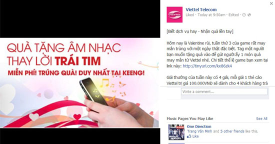 Viettel dành tuần 3 chương trình - “Biết dịch vụ hay Nhận quà liền tay” để giới thiệu dịch vụ “Quà tặng âm nhạc thay lời trái tim”. Đây là dịch vụ rất hữu ích cho ngày Valentine trên keeng.vn.