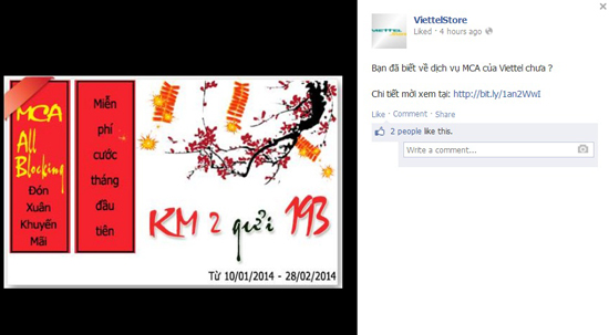 Dịp Tết, từ ngày 10/1 đến hết 28/2, Viettel sẽ miễn phí cước tháng đầu tiên cho các khách hàng sử dụng dịch vụ thông báo cuộc gọi nhỡ MCA. Để nhận khuyến mãi, khách hàng cần soạn tin theo cú pháp KM 2 gửi 193.