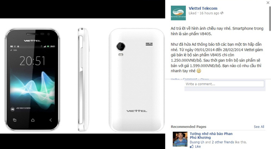 Viettel cho biết giá bán lẻ bộ sản phẩm V8405 đã được giảm xuống chỉ còn 1.250.000 đồng, áp dụng từ ngày 9/1 đến 28/2. Sau thời gian trên, V8405 sẽ được bán với giá 1.599.000 đồng.