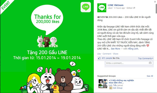 Hôm nay LINE bắt đầu triển khai chương trình tặng 200 gấu bông cho các fan nhân dịp fanpage Việt Nam đạt mốc 200.000 fan theo dõi. Tiêu chí để được tặng quà là bình luận được nhiều người hưởng ứng nhất.