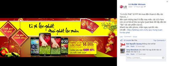 Khi mua điện thoại của LG, khách hàng sẽ được FPT Shop tặng những bao lì xì may mắn trị giá 68.000 đồng (68 mang ý nghĩa Lộc Phát), ngoài ra còn có cơ hội sở hữu tai nghe bao da và tai nghe QuadBeat.