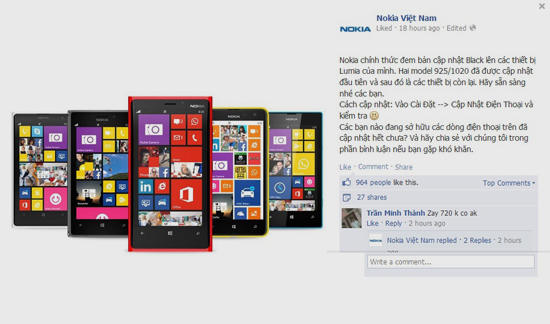 Nokia đã chính thức tung ra bản cập nhật firmware Lumia Black cho các đời máy Lumia 925 và Lumia 1020. Tiếp sau đó sẽ là các thiết bị còn lại, vì thế Nokia khuyên bạn nên thường xuyên kiểm tra mục Cài Đặt - Cập Nhật Điện Thoại để nắm tình trạng nâng cấp.