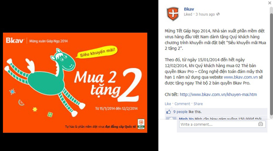 Để mừng Tết Giáp Ngọ 2014, Bkav tuyên bố sẽ áp dụng chương trình khuyến mãi “Mua 2 tặng 2”, nghĩa là khi khách hàng mua 2 thẻ bản quyền Bkav Pro thời hạn 1 năm sử dụng sẽ được tặng thêm 2 bộ. Đây cũng là cách Bkav khuyến khích người dùng máy tính mua số lượng lớn.