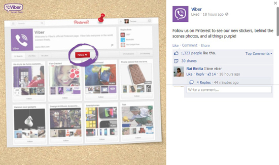 Viber khuyến khích các fan theo dõi tài khoản Pinterest của Viber để liên tục cập nhật những sticker mới nhất, những bức ảnh đằng sau hậu trường.và cả bộ sưu tập những món đồ màu tím đặc trưng của ứng dụng này.
